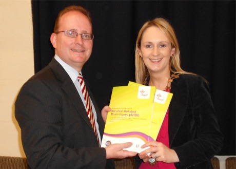 North West Alcohol Forum director, Eamon O'Kane presents a copy of the Alcohol Related Brain Injury report to Cllr Cora Harvey on one of her last engagements Donegal mayor.