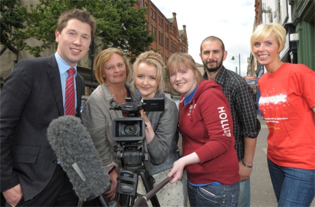 Budding Carn film maker, Marie Matthews, third from right, who took part in a documentary shoot in Belfast in the run up to the 2012 Olympics. Also pictured are Paul Reilly, reporter, ITV Daybreak Northern Ireland, Marian Clark de Monreal, Legacy Trust, young filmmaker, Mairead Carten from Derry, Tristan Crowe, Northern Visions and Laura Carlisle, Cinemagic.