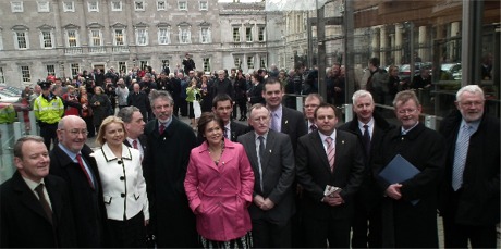 Deputy Pádraig MacLochlainn pictured with colleagues outside Leinster House before taking his seat in the 31st Dáil.