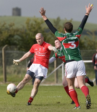 Despite monumental efforts by Carn around the middle of the park, with big Dermot Simpson in particular now claiming more than his fair share of ball, Carn were unable to get scores on the board. Michael McLaughlin did raise the flag for the visitors with a fabulous individual score but in a three minute spell before half-time the home side went on a rampage that yielded three points – two from O’Hagan and one from Ryan McErlean.