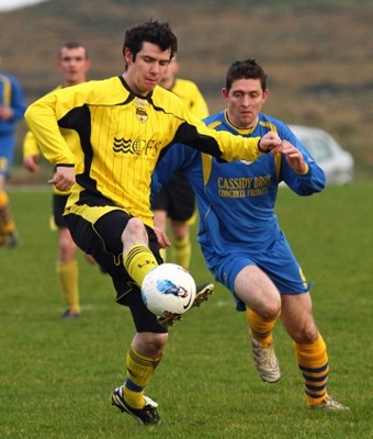 Glengad United...5 (T. Doherty 3, P. McDermott 2) Aileach...0 Caoimhinn Barr reports from the Crua (Photos: Herbie Barr) GLENGAD United stormed to the top of the Inishowen League after dismantling title rivals Aileach at a windswept Crua on Sunday afternoon. A Terence Doherty hat-trick and a brace of strikes by Patrick McDermott helped the north Inishowen men ease to victory to leave Brian Bell’s one hundred per cent league record in tatters. If the spectators at one of the peninsula’s most remote pitches were in any doubt as to who the best team in Inishowen was prior to kick-off, there was no doubt by 3.45pm. Last year’s runners-up are no longer dark horses. Underlining their title credentials with some scintillating football, Glengad thoroughly enjoyed their win. Goalscorers Doherty and McDermott wasted no time in silencing the Aileach bench with vociferous displays of celebration. Missing regular goalkeeper David McGeady and lightning wideman Gary Collett, Aileach were never at the races and capitulated in the second-half, conceding four more times, after trailing 1-0 at the break. With United duo Patrick McDermott and Kevin McColgan keeping the ball impressively in midfield, winger Seamus Doherty was also in sparkling form as the home team played round their opponents with their own brand of ‘Tiki Taka’ football. |