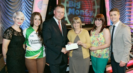 Lucky local player, Margaret, is pictured at the show's studios with from left: Sinead Kennedy, gameshow host; Anne Marie Doherty, National Lottery ticket selling agent from Eurospar, Newtowncunningham; Dermot Griffin, National Lottery chief executive; Laura Doherty, National Lottery ticket selling agent from Eurospar, Newtown and Brian Ormond, gameshow host.