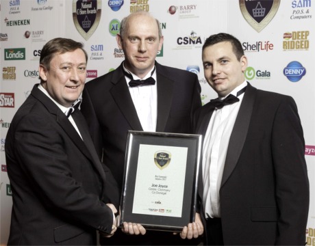 President of Convenience Stores and Newsagents Association (CSNA), Jim Bird, presents the 'Best Community Initiative' award to Joe Joyce and Derek Murphy of Joyce’s Centra, Clonmany, Co Donegal.