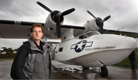 Historian Dan Snow in front of a Catalina flying boat..
