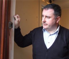 Fr Gerard Sweeney surveys the damage to his front door that was kicked in by the three-man gang.