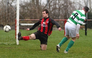 A minute later McElhinney fired wide after controlling Conor McLaughlin’s pass on the right before home keeper McCole dived bravely at the feet of Nigel McMonagle to deny the Moville striker.