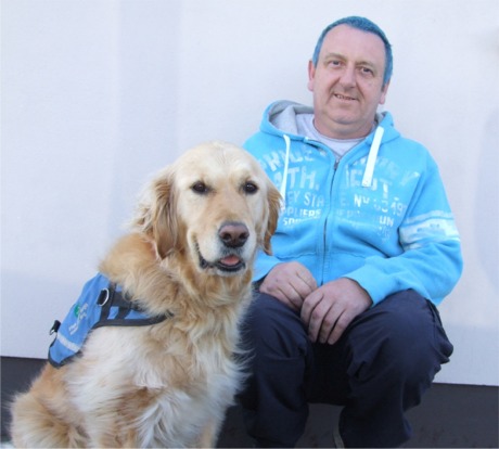 Blue-ming marvellous: Michael Kerrigan, who has dyed his hair blue to raise awareness about autism, pictured with son Cormac's gorgeous assistance dog, Gael.
