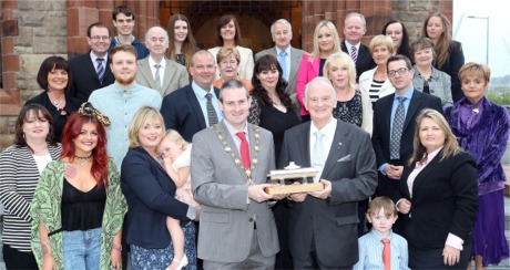 Derry Mayor Cllr Martin Reilly pictured with Dr Tom McGinley and members of Dr McGinley’s family at a private reception earlier this week in the Guildhall.