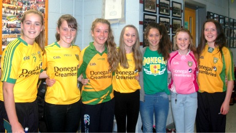 Moville Community College pupils show their colours ahead of Sunday's Croke Park showdown.