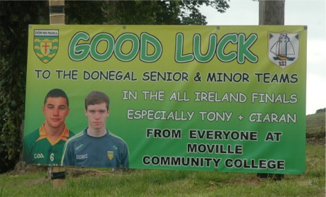 Moville Community College erects a hoarding to send best wishes to past pupils Tony McClenaghan and Ciaran Diver who are on the All Ireland minor panel.