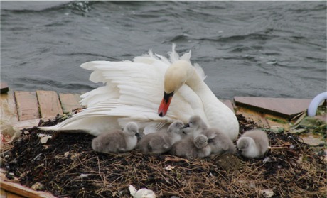 But against all the odds the 12-year old waterbirds are now first-time parents to five fluffy cygnets thanks to a team of volunteers led by mechanical engineer Peter Butler, who built them a floating love-nest.