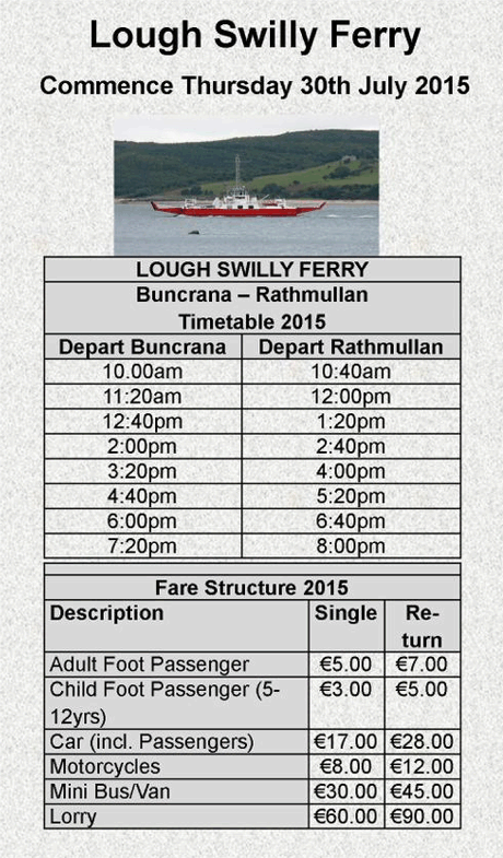 THE Rathmullan to Buncrana car ferry service will resume this Thursday, July 30, for a six week period. The new operator for the summer service is the Arranmore Car and Passenger Ferry Service. Check out the timetable for the Swilly crossings below...