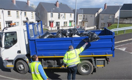 Martin Roarty and Noel O’Donnell from Donegal County Council collecting rubbish picked up by residents in Bridgend.