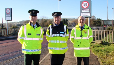 Inspector John Miller, PSNI, Inspector Michael Harrison, An Garda Siochana and Donegal Road Safety Officer, Brian O’Donnell launch this year’s cross border Christmas Drink Driving campaign on the N14 at Lifford/Strabane.