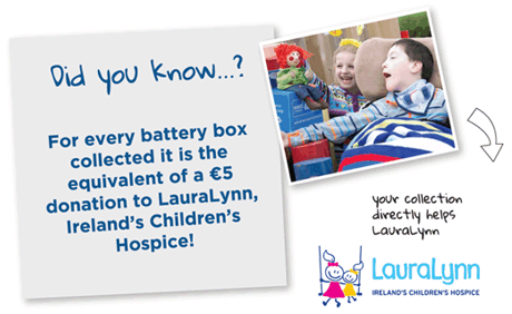 Every battery that is collected for recycling goes towards a monetary donation for the LauraLynn@HOME service which brings hospice care into the comfort of a child’s own home.