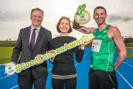 Pictured at the University of Limerick for the launch of the National Lottery Good Causes Awards 2019 are Olympic hurdler Thomas Barr, Theresa Kavanagh of the Children's Grief Centre (which was awarded Overall Good Cause winner in 2018), and National Lottery CEO Dermot Griffin.
