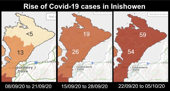 The incidence of Coronavirus has risen dramatically in Inishowen, according to the latest statistics on Ireland's COVID-19 Data Hub . The figures, released today, show that in the fourteen days up to Monday, 5th of October, the rate of infection has increased in North Inishowen to 59 cases. In South Inishowen the number of cases has risen to 54.