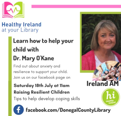 DONEGAL Library Service are delighted to announce that Dr Mary O’Kane will be hosting a talk on Saturday, 18th July, at 11am with the theme of ‘Raising Resilient Children’. This talk will be available on the Donegal Library Services Facebook Page .