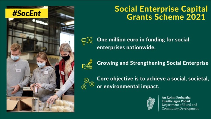 The Minister for Rural and Community Development, Heather Humphreys and Minister of State with responsibility for Community Development has announced the Social Enterprise Capital Grant Scheme 2021 for social enterprise groups with a national allocation of one million euro.