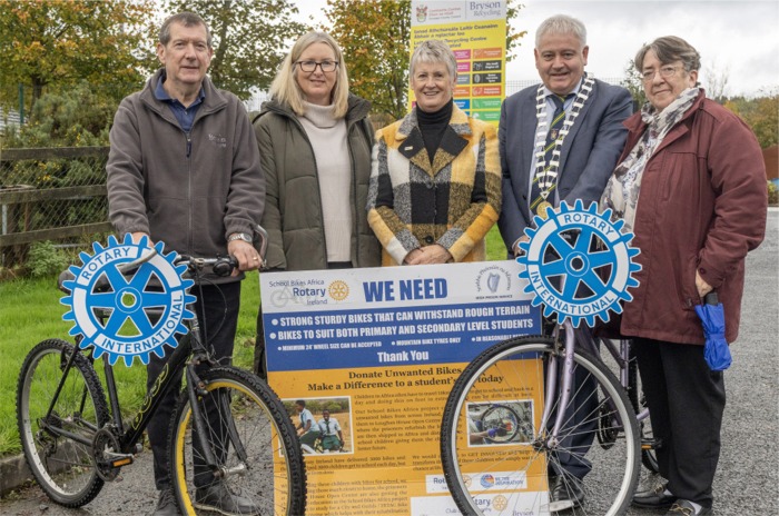 Cathaoirleach Cllr Martin Harley pictured with Connie Gallagher (Bryson Recycling), Fiona Kelly (Donegal County Council), Cynthia Furey and Doreen Sheridan Kennedy (Letterkenny Rotary) at the launch of the School Bikes for Africa.