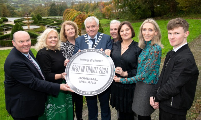 Donegal Top Region, Lonely Planet 2024. Garry Martin, Director of Economic Development, Emergency Services and Information Systems (Donegal County Council), Mary Daly (Donegal Tourism), Margaret Sweeney (Donegal Tourism), Cathaoirleach Cllr Martin Harley (Donegal County Council), Shane Smyth, (Discover Bundoran), Sarah Nolan, a/Head of Tourism (Donegal County Council), Marion Callaghan (Donegal Tourism) and James Cassidy (Donegal Tourism). Photo Clive Wasson.