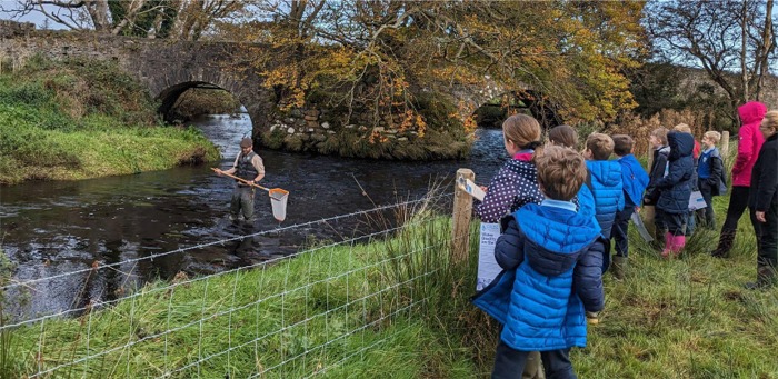 Mill River Conservation Group’s Tomas Lawrance collecting samples from the Culdaff River whilst St. Boden’s pupils watch on.