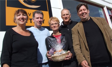 Larry and Jo are presented with some Moville pottery. From left, Mary Lorraine McHugh, Brian McLaughlin, Jo and Larry Etler and Martin Lynch.