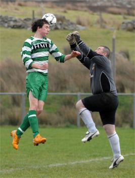 A superbly taken first half goal from the impressive Terry Doherty, and a second half own goal from Shaun Porter (under pressure from Alan Orr) was enough to see Liam McClean’s side move to within a point of Cockhill at the top of the table. Unbeaten in the league this season, Glengad have three games in hand on Cockhill and two in hand of third placed Illies.