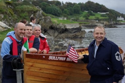 A US Naval representative is joined by Moville College principal Anthony Doogan, Robert Kelly and John White at the launch of the new Foyle punt 'Sullivan Brothers'.