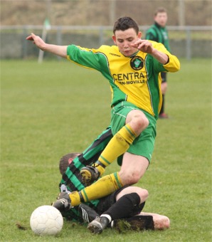 combining well down the right flank. On 20 minutes Doherty dashed down the right and played a high cross that was met on the back post by McLaughlin but he skied his finish. Two minutes later Jonathan Eccles went on a darting run but just overran the ball and the climax. With the Aileach central defensive pairing of Thomas McMonagle and James Gillespie in tune at the heart of the Inishowen defence nothing was getting through from the men in green and black. The best the visitors could offer in the opening quarter was Ross Gildea’s cheeky chip from 40 yard which was well measured but didn’t fool Rory Kelly in the Inishowen net. Doherty continued to torment the visiting left back and on the half hour his deep cross just eluded the onrushing |