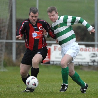 During the interval the big question on supporters’ minds was whether Redcastle could keep up the relentless pace they had imposed in the first half. The home side were almost caught out from the opening whistle when Patrick McGarry put David Norris through but Redcastle managed to scramble the ball away. This was the best spell of the game for Pike Rovers as goal scorer Keith Harnett had a header saved and a shot blocked. Patrick Maloney also hit over and Redcastle goalkeeper Gerard Crossan had several vital takes. In an attempt to take the lead Rovers sent on junior international David Wall to try and make a breakthrough.
