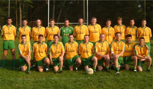 From left to right back row: Pat Callaghan, Carndonagh, Darren Duffy, team selector Malin, Connie McEleney, honoury club president, John Deery, Malin, Jonathan Byrne, Malin, Rory Grant, Burt, Emmet McLaughlin, Moville, Danny Friel Urris, Shane Kelly, Urris, Damian Harkin, Urris. Front row: Eamonn Kelly, team manager and player, Buncrana, with children and Paul Friel, team captain, Urris.