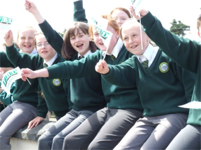 Pupils from Scoil Naomh Brid, Muff, give a big cheer to the Milk Ras cyclists.